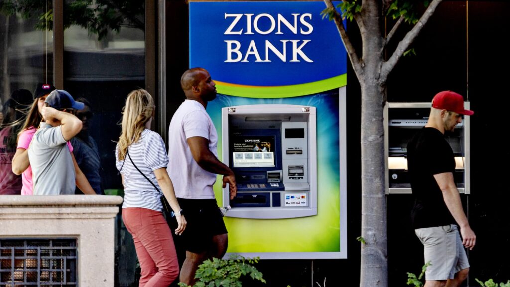 Automated teller machine at Zions Bank headquarters in Salt Lake City, Utah, July 10, 2023.