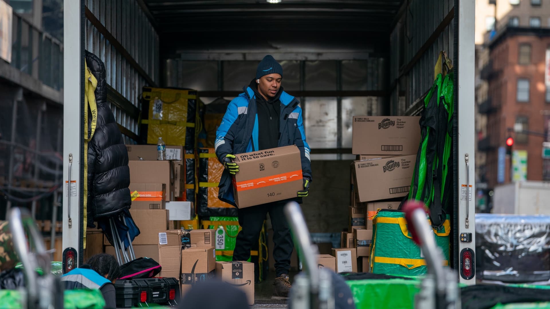 An Amazon employee unloads a package in New York on November 29, 2024.