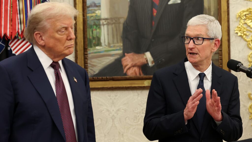 Apple CEO Tim Cook (R) speaks as US President Donald Trump looks on at an event in the Oval Office of the White House on August 6, 2025 in Washington, DC.