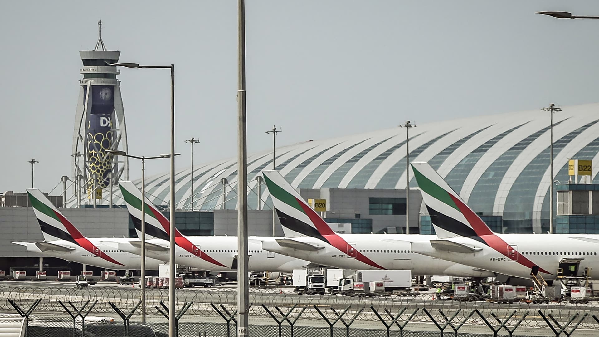 A passenger plane sits on the tarmac at Dubai International Airport in Dubai, March 11, 2026. On March 11, as Iran continued its campaign to disrupt oil markets and air and sea traffic, a drone crashed near Dubai airport in or near the Strait of Hormuz, injuring four people.