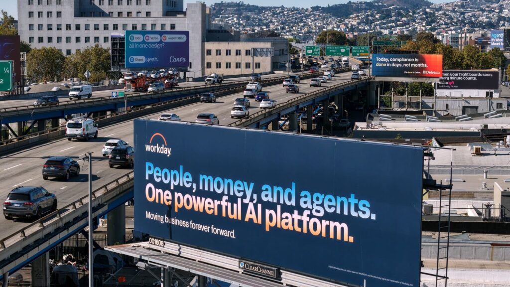 Aerial photograph of a sign advertising an artificial intelligence (AI) company in San Francisco, California, September 16, 2025.