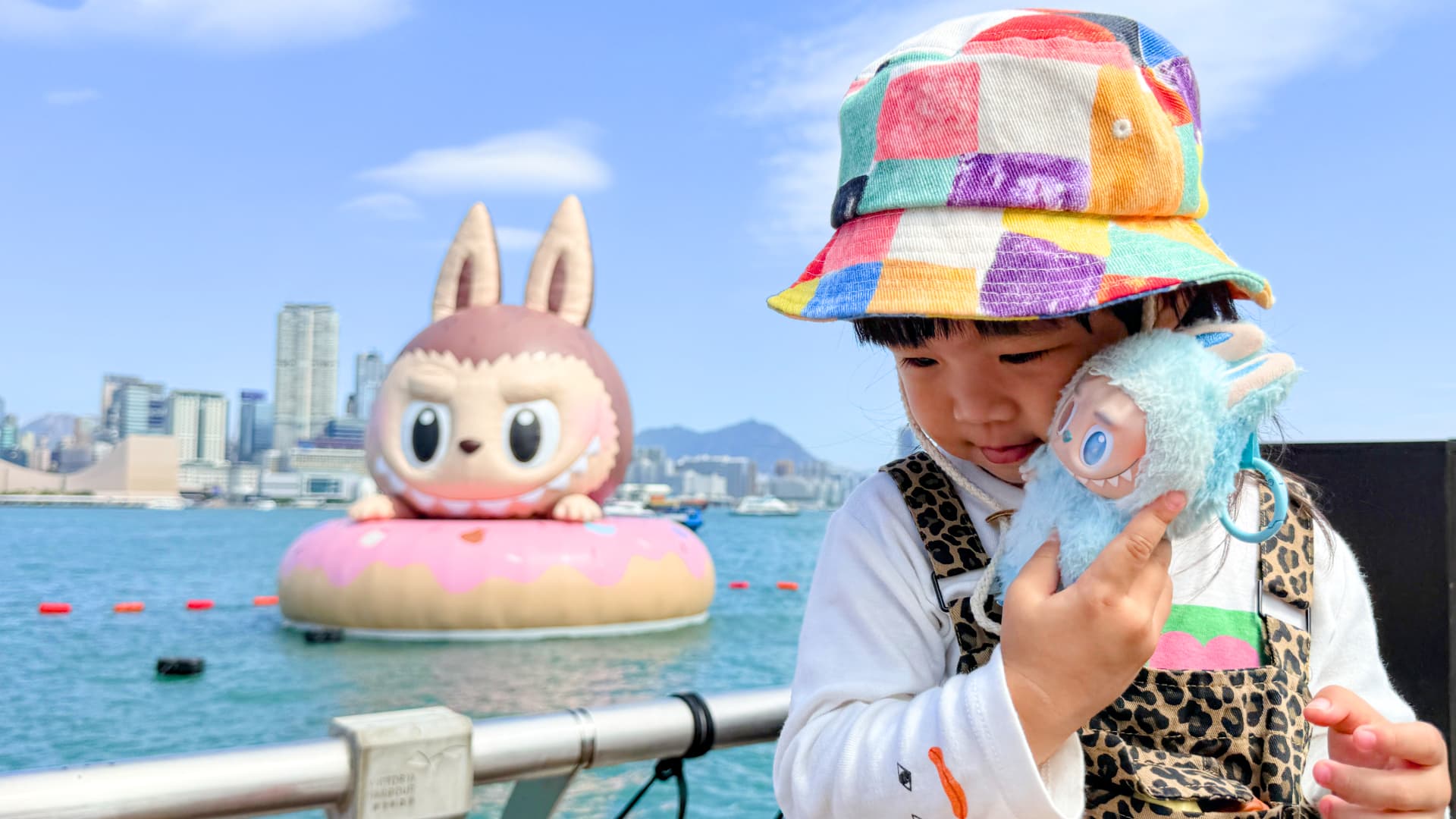 On October 25, 2025, a giant inflatable toy called “Lovebu” floats on the surface of Victoria Harbor in Hong Kong, China.