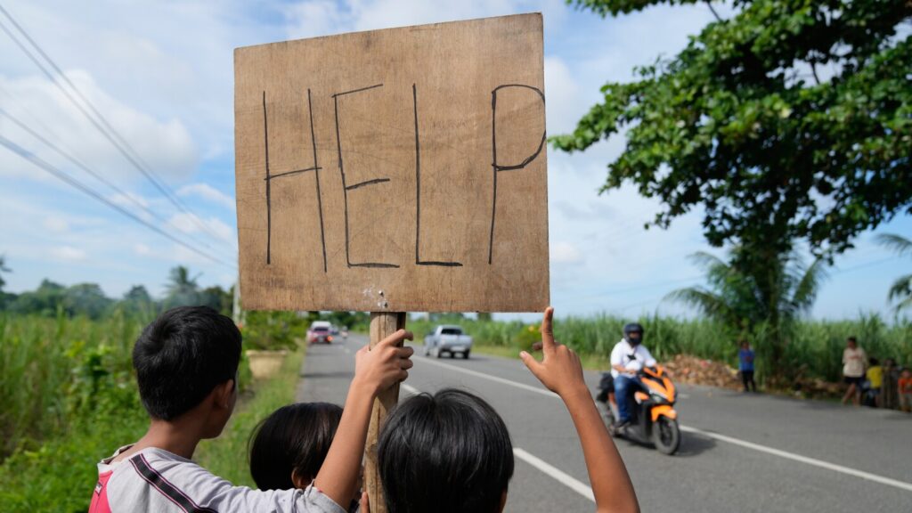 Earthquake survivors are holding a “help” sign along the road on Thursday, October 2, 2025, days after a strong earthquake occurred in Medellin, Cebu, central Philippines. (AP photo/Aaron Fabira)
