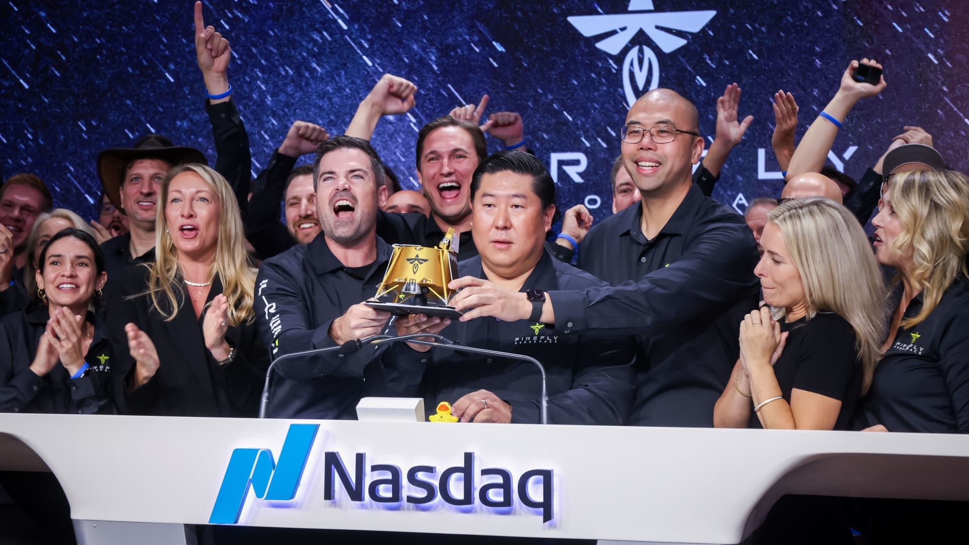 Jason Kim, CEO of the Center’s Firefly Aerospace, during the company’s first public release on the Nasdaq MarketSite in New York, USA, on Thursday, August 7, 2025.