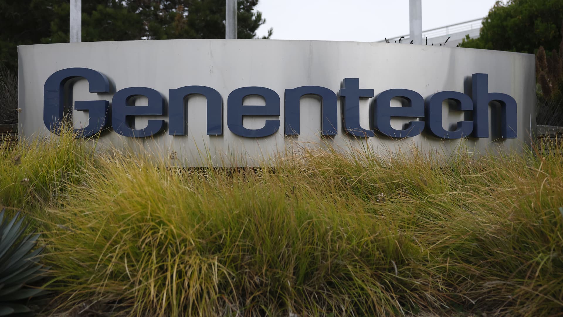 A sign posted in front of Genentech’s offices in South San Francisco, California on June 12, 2025.