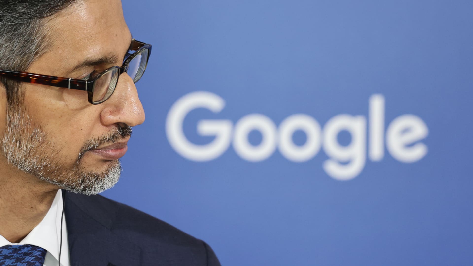 Google CEO Sundar Pichai during a press conference after meeting with Polish Prime Minister Donald Tusk at the Warsaw Google for Startups Campus on February 13, 2025 in Warsaw, Poland.