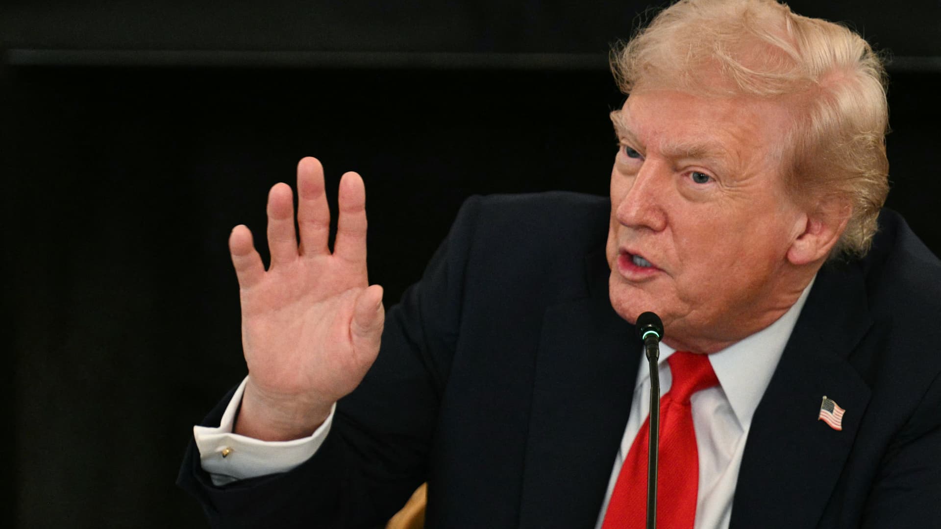 U.S. President Donald Trump speaks during a roundtable discussion about the anti-fascist movement Antifa, which he has designated as a domestic terrorist organization, at the official dining room of the White House in Washington, DC, on October 8, 2025.