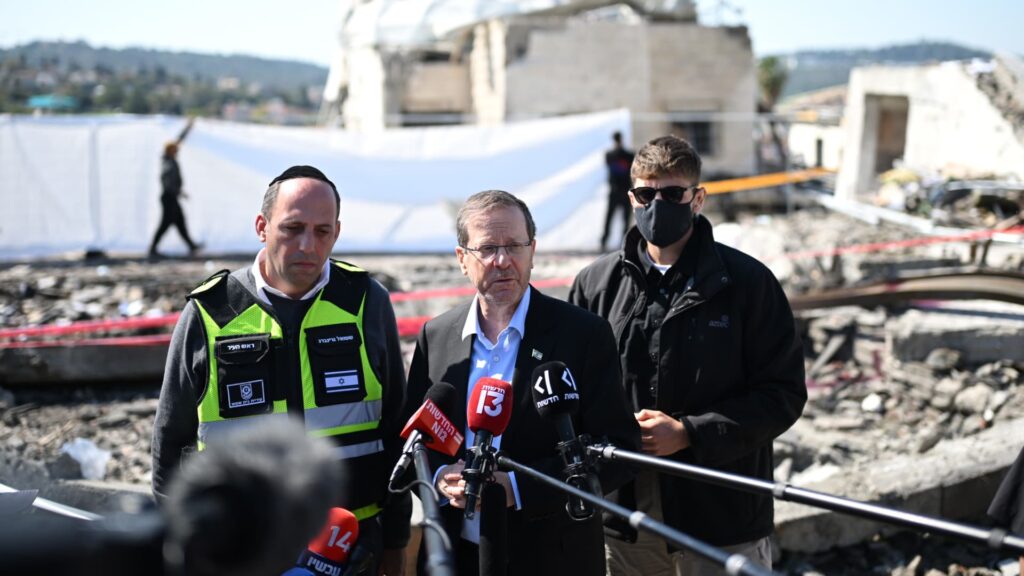 Israeli President Isaac Herzog visits the site of an Iranian attack in Beit Shemesh, Israel, March 2, 2026.