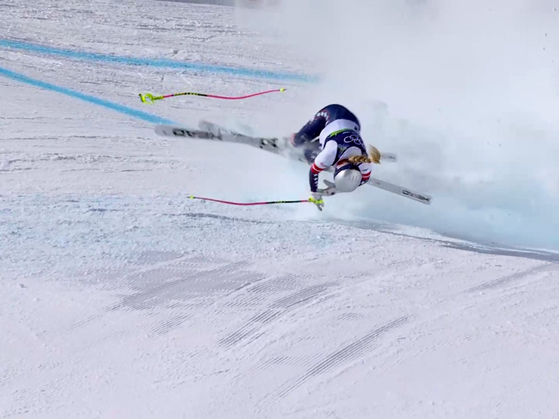 The 2010 Olympic downhill champion first hit hard snow just 13 seconds into his descent. She then fell down the slope with her skis on, potentially causing more serious damage to her knee.