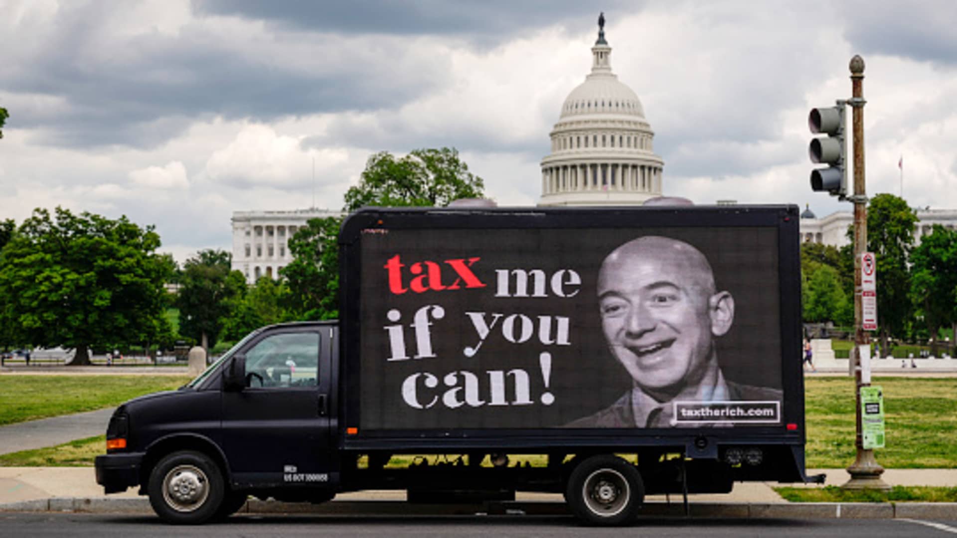 A moving billboard with an image of Jeff Bezos calls for higher taxes on the ultra-wealthy in Washington, May 17, 2021.