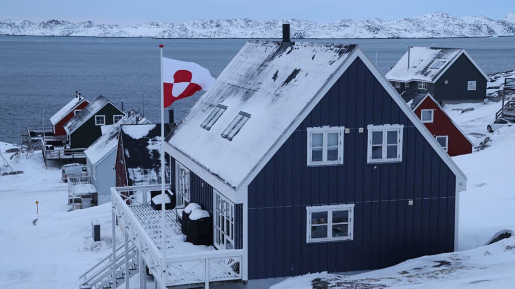 The Greenlandic flag flies over a house in Nuuk, Greenland, on January 21, 2026.