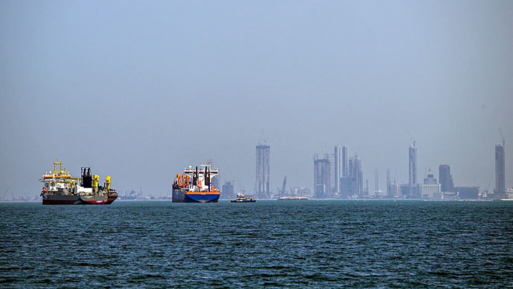A commercial ship photographed off the coast of Dubai on March 11, 2026.