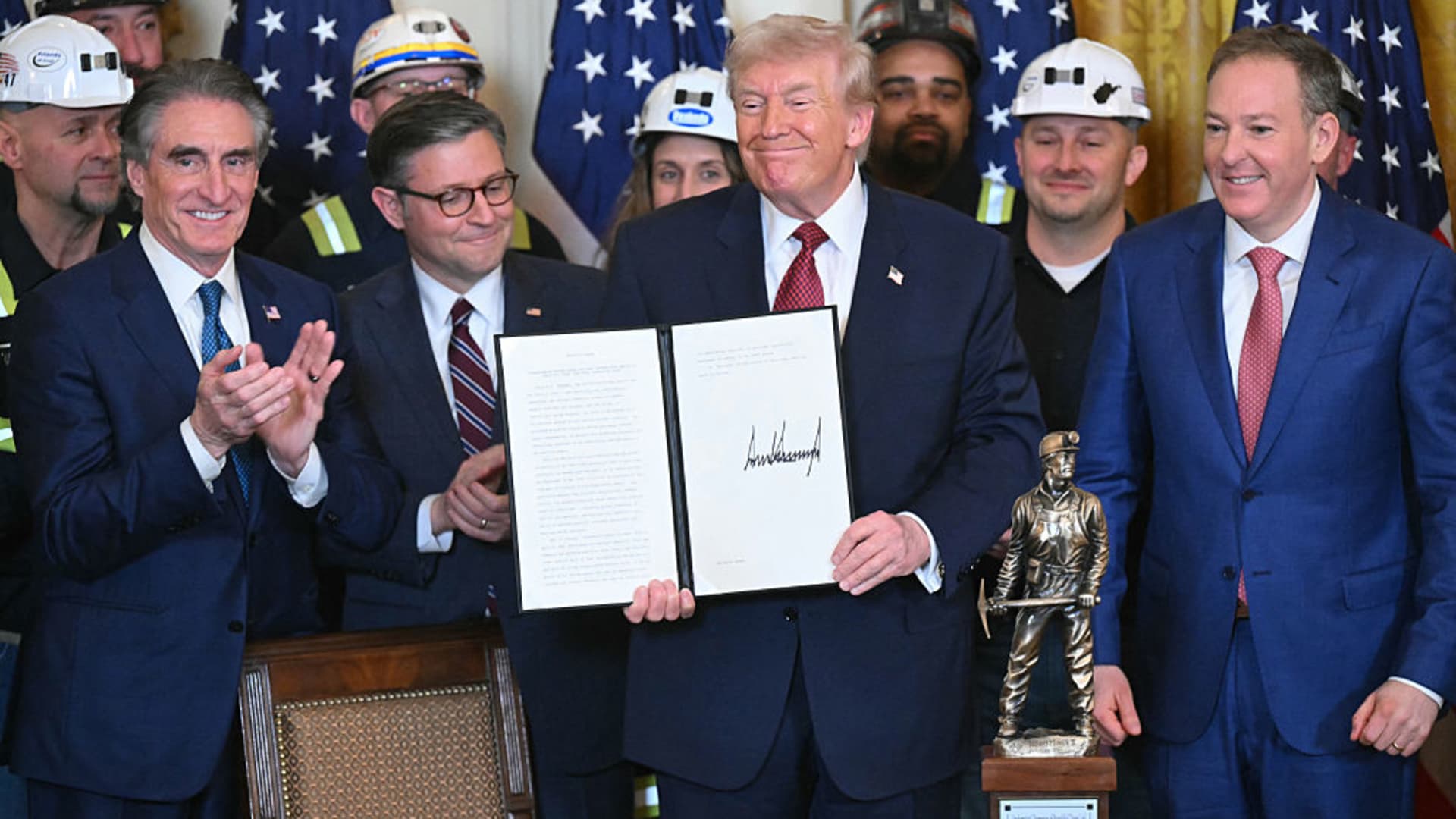 U.S. President Donald Trump, U.S. Secretary of the Interior Doug Burgum, Speaker of the House Mike Johnson, and EPA Administrator Lee Zeldin hold up a signed executive order directing the military to purchase electricity from coal-fired power plants during a “Coal Champions” event at the White House on February 11, 2026 in Washington, DC.