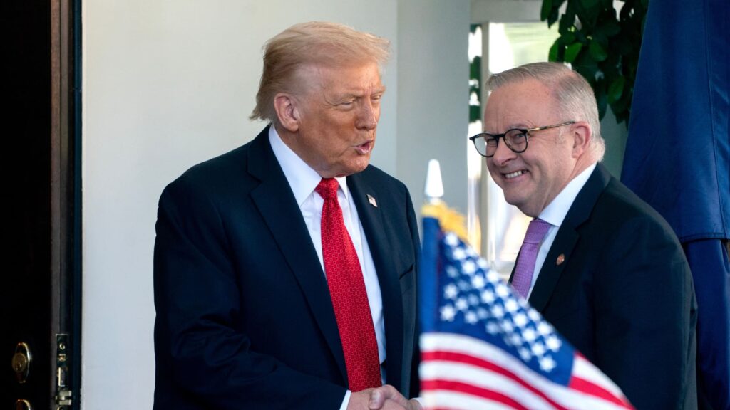 U.S. President Donald Trump and Australian Prime Minister Anthony Albanese shake hands outside the West Wing of the White House on Monday, October 20, 2025 in Washington, DC, USA.