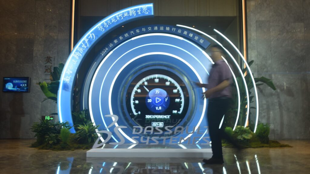 Hangzhou, China – June 14, 2024 – A guest walks past the logo of the 2024 Dassault Systèmes Automotive and Transportation Industry Summit Forum in Hangzhou, Zhejiang Province, China on June 14, 2024. (Photo credit: CFOTO/Future Publishing via Getty Images)