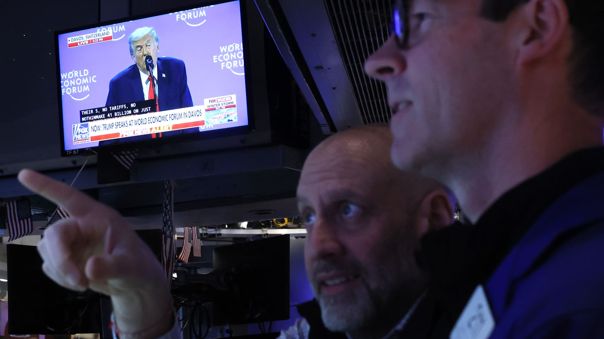Traders work on the floor of the New York Stock Exchange during morning trading on January 21, 2026.