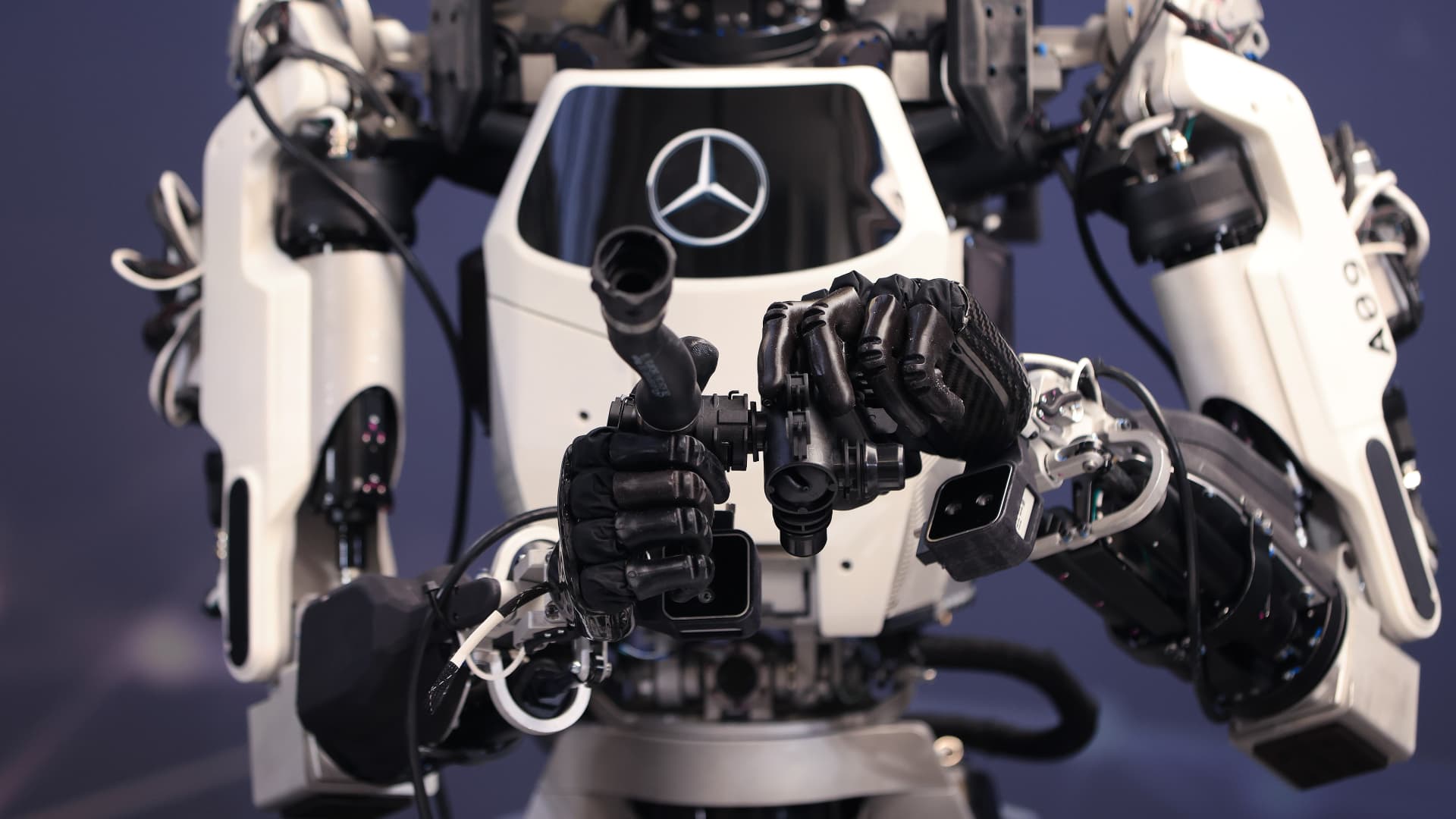 A prototype of the Apollo humanoid robot manufactured by Apptronik Inc. demonstrates its dexterity during media day at the Mercedes-Benz Digital Factory Campus in Berlin, Germany, Tuesday, March 18, 2025.