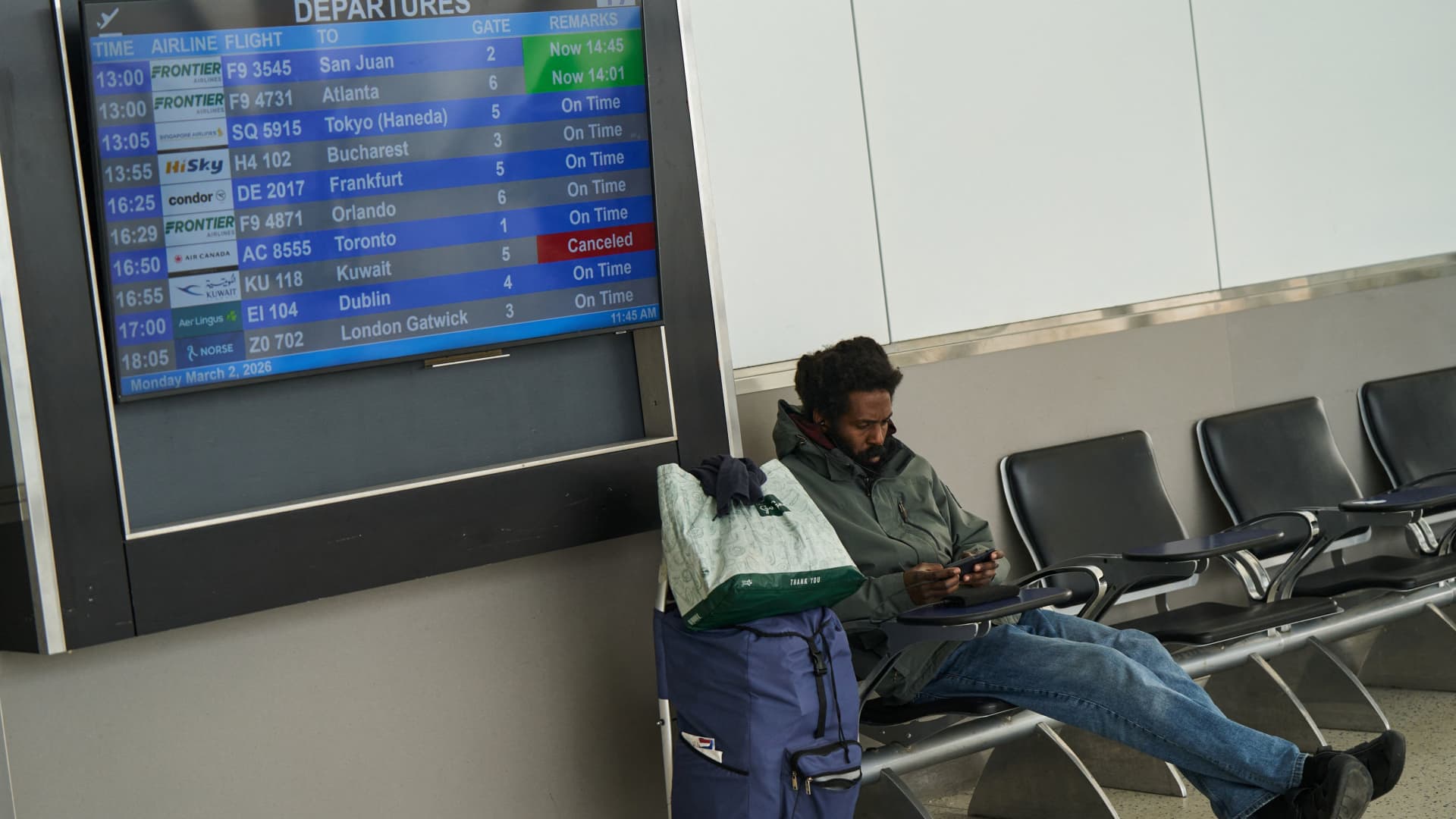 A traveler uses a cell phone next to a departures board displaying canceled Kuwait Airways flights amid the U.S.-Israel-Iran conflict at John F. Kennedy (JFK) International Airport’s Terminal 7 in New York City, U.S., March 2, 2026.