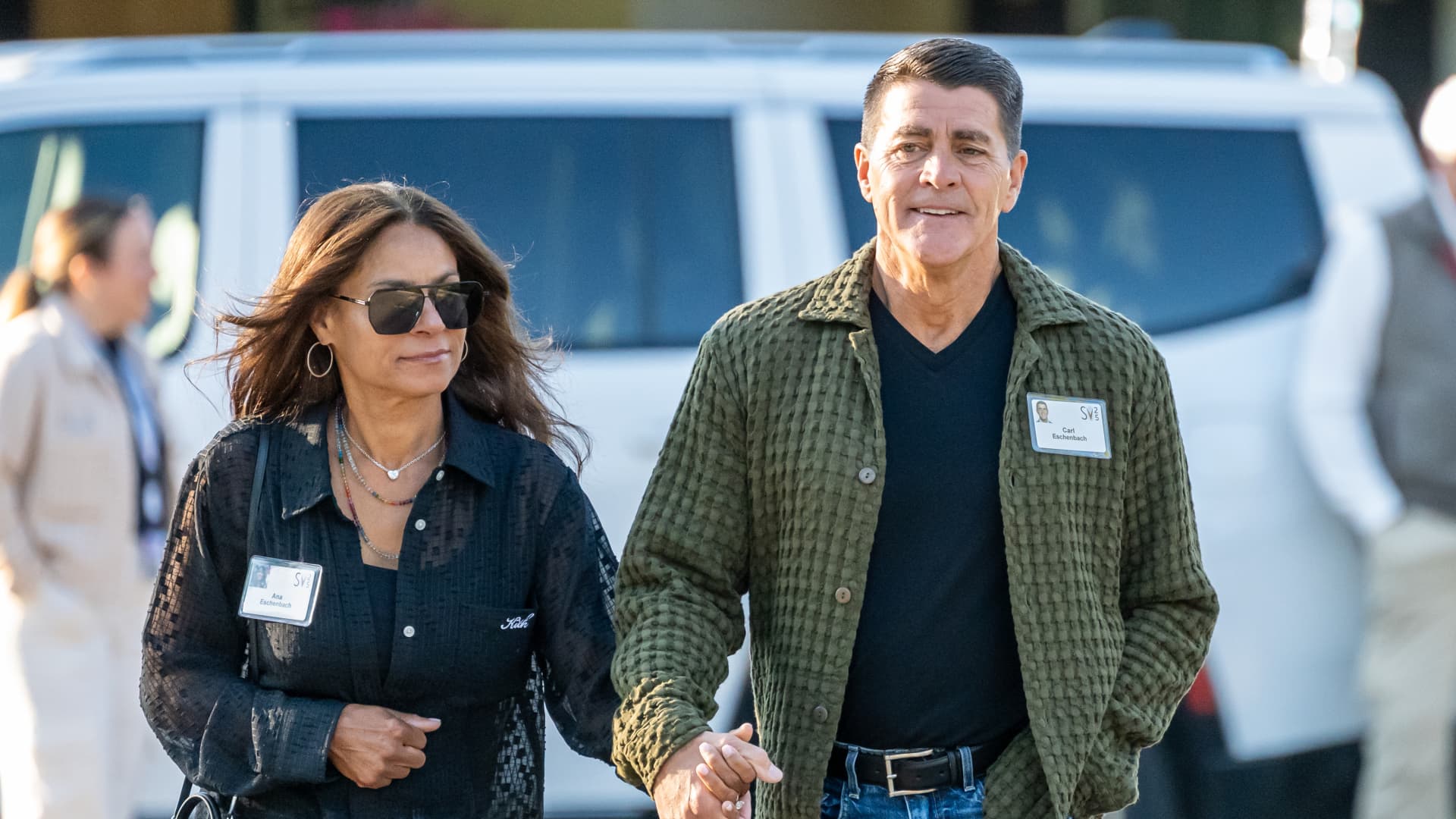 Workday CEO Carl Eschenbach (right) heads to the morning session of the Allen & Co. Media and Technology Conference on July 11, 2025 in Sun Valley, Idaho.